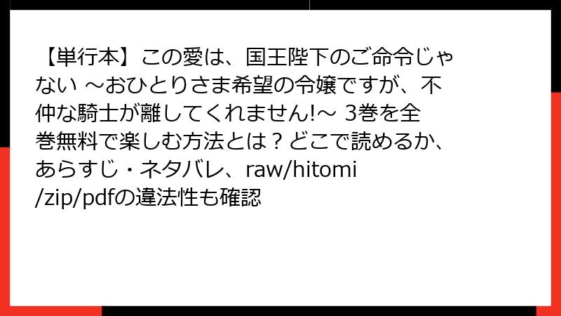 こんにちは、漫画オタク歴20年の“正規版ガチ勢”ライター、みゆきです。今日は、『この愛は、国王陛下のご命令じゃない ~おひとりさま希望の令嬢ですが、不仲な騎士が離してくれません!~』3巻を、raw・hitomi・zip・pdf・漫画バンクなどの海賊版サイトで読むことのリアルなリスクを、ガチでぶっちゃけます。