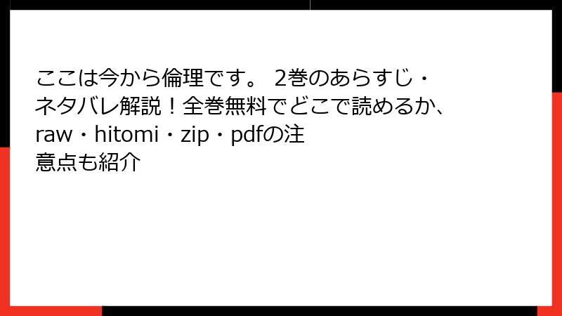 こんにちは、漫画ファン保護隊です! 大好きな『ここは今から倫理です。』を「raw」「hitomi」「漫画バンク」「zip」「pdf」などの海賊版サイトで読もうとしているあなた――ちょっと待ってください! 一見「無料でお得」に見えても、そこには取り返しのつかないリスクが潜んでいます。この記事では、法的・セキュリティ・倫理的観点から、具体的に何がヤバいのかをガッツリ解説します。高柳先生の「ここは今から倫理です。」の精神で、正しい選択をしましょう!
