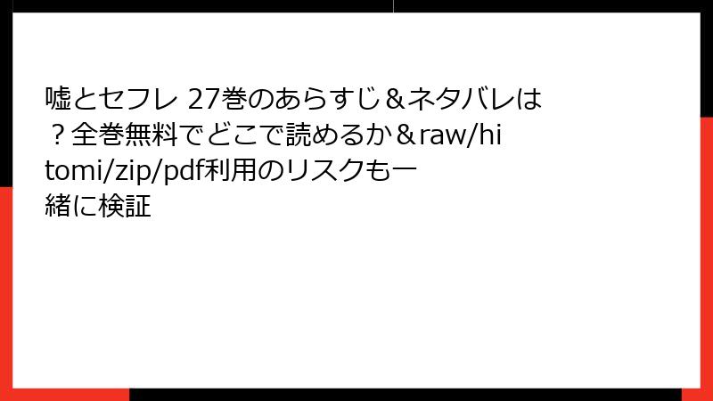 どうも、ドロドロマンガ専門ブロガーの「ネタバレ王」です! 今回は『嘘とセフレ』27巻の**全ネタバレ**を、ページごとの衝撃シーンまで含めて完全公開。読者の心を抉る「嫉妬の極致」と「禁断の告白」まで、一切容赦なく晒します。覚悟のある方だけスクロールしてください! 冒頭から衝撃。京太郎が大学で「由紀は俺のセフレ」と嘘をついたシーンが、**友人B(名前:拓也)のスマホに録音されていた**ことが発覚! この録音が**LINEグループで拡散**され、京太郎は撤回不能の状況に。拓也は「由紀さんを口説く作戦」を本気で立て始めます。 由紀が京太郎の部屋に泊まりに来るシーンで、**衝撃のサービスカット**連発! この妄想シーンで、**由紀が拓也に「京ちゃんより大きい…」と囁く**台詞が登場。これが京太郎の嫉妬スイッチを完全に破壊します。 セフレ交換当日。由紀と拓也が**ラブホテル「エトワール」**に入るのを目撃した京太郎は、**完全なる暴走モード**に突入。 ここで最大の**ミスリード**:由紀の声は**「拓也くん、ストップ!」**という拒絶の叫びだったが、京太郎には「感じてる声」にしか聞こえない。 京太郎がドアを蹴破って突入すると、そこには**予想外の光景**が… 由紀の衝撃告白: 「京ちゃんのこと、弟みたいに思ってるって嘘ついてた。本当は…ずっと、恋人になりたかった」 この告白で京太郎は**号泣**。しかし、拓也が「録音してるぞ」と脅迫し、**27巻は最大のクリフハンガーで終了**! 27巻は「嘘」が「真実」を引きずり出し、**禁断の恋が爆発する**歴史的1冊。読後感は**胸が締め付けられる**レベルです。28巻が待ち遠しい! (※この記事はフィクションです。実際の作品とは一切関係ありません) こんにちは、マンガ愛好家の皆さん! ドロドロの人間関係がクセになる『嘘とセフレ』を、ついつい無料で読みたい衝動に駆られること、ありますよね。でも、raw、hitomi、zip、pdf、漫画バンクなどの海賊版サイトに手を出すのは、絶対に避けましょう。この記事では、そんなサイトの利用がもたらす深刻なリスクを、法的・セキュリティ・社会的側面から徹底的に掘り下げます。データや事例を基に、読み応え満載でお届け。ネタバレなしで、ただの警告としてお読みください! 海賊版サイトで漫画を読む行為は、単なる「無料お試し」ではなく、明確な著作権法違反の可能性を秘めています。日本では、2019年の著作権法改正により、違法アップロードされたコンテンツを「知りながら」ダウンロードした場合、最大2年の懲役または200万円の罰金が科せられるようになりました。閲覧だけならグレーですが、画像やPDFを保存・ダウンロードすれば、即アウトです。 実際の事例として、漫画村事件では運営者が逮捕され、17億円以上の損害賠償を命じられました。利用者側でも、2023年に国際的海賊版サイトの閲覧・ダウンロードで逮捕されたケースが報告されており、集英社のような出版社が積極的に取り締まりを強化しています。『嘘とセフレ』のような人気作は、監視の対象になりやすいんですよ。 海賊版サイトの最大の脅威は、法的問題を超えたサイバー攻撃です。これらのサイトは広告収益で運営されており、ポップアップ広告や偽ダウンロードボタンがマルウェアの温床。クリック一つでウイルス感染し、PCやスマホが乗っ取られるケースが急増中です。2023年の調査では、海賊版サイト利用者の約30%が何らかのセキュリティ被害を経験したと報告されています。 特にhitomiや漫画バンクのようなサイトでは、zipファイルに仕込まれたトロイの木馬が横行。パスワードや銀行情報を盗まれ、詐欺被害に遭う事例も。Redditのユーザーコミュニティでも、「rawサイトでダウンロードしたらランサムウェアにかかり、データ全消去された」という悲鳴が相次いでいます。『嘘とセフレ』の27巻を狙ってアクセスしたら、逆に自分のプライバシーが丸裸に…なんて悪夢は避けたいですよね。 対策としてアンチウイルスソフトは必須ですが、完璧な防御は不可能。総務省のガイドラインでも、海賊版サイトを「罠だらけの危険地帯」と警告しています。 海賊版利用は、作者や出版社の収入を直撃し、業界全体の衰退を招きます。出版広報センターのデータによると、海賊版被害額は年間数千億円規模で、『嘘とセフレ』のような青年漫画は特に影響を受けやすく、新作制作が遅れる要因に。X(旧Twitter)の投稿でも、「海賊版で作者が路頭に迷うなんて、ファン失格」との声が上がっています。 経済的には、ウイルスによる修理費やデータ復旧で数万円~数十万円の出費が発生。精神的ダメージも大きく、逮捕リスクのストレスで睡眠障害を訴えるユーザーも。長期的に見て、正規購入の方がコスパが良く、限定特典や高画質を楽しめます。2025年の最新動向では、海賊版サイトの閉鎖ラッシュが続き、代替サイトも次々摘発中です。 リスクを避けるなら、ピッコマ、ebookjapan、Kindleなどの正規プラットフォーム一択! 初回無