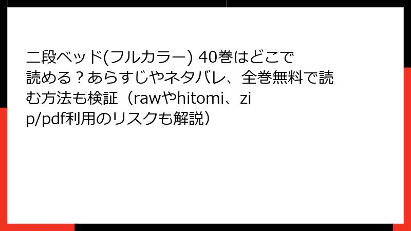 「最新巻を無料で今すぐ!」——そんな誘惑に負けて、raw、hitomi、漫画バンク、zip、pdf……いわゆる海賊版サイトに手を伸ばしたことはありませんか? 確かに一瞬だけ“お得”に見えるかもしれません。でも、画面の向こうには、あなたが想像する以上のリスクが潜んでいます。今回は『二段ベッド(フルカラー)』を例に、海賊版利用がもたらす“5つの実害”を、データと具体例で丸裸にします。スマホ1台で人生が変わる——そんな恐ろしい現実を知ってください。