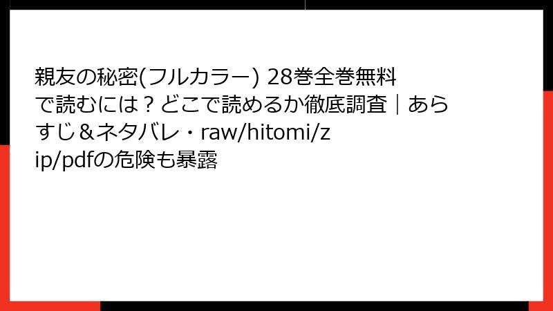 こんにちは、漫画好きのブロガー、マンガマニアです! 大人気フルカラー作品『親友の秘密(フルカラー)』の28巻ネタバレに続き、今回はちょっと真面目なテーマ。raw、hitomi、zip、pdf、漫画バンクなどの海賊版サイトで無料で読もうと考える方もいるかもしれませんが、それは絶対にやめておいた方がいいです。なぜなら、表面上の「無料」には、想像以上のリスクが潜んでいるから。この記事では、法的・セキュリティ・倫理的観点から、具体的な危険性を詳しく解説します。読み応え重視で、箇条書きやテーブルも活用してまとめました。あなたのスマホやPC、そして好きな漫画業界を守るためにも、ぜひ最後まで読んでください!