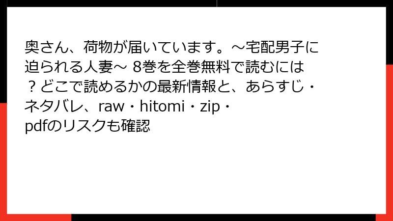 どうも、漫画ブロガーのKです! 今回も「奥さん、荷物が届いています。~宅配男子に迫られる人妻~」8巻をテーマに、海賊版サイト(raw、hitomi、漫画バンク、zip、pdfなど)で読むことの危険性をガチで掘り下げます。無料で読める誘惑はデカいけど、実はスマホ1台で人生が傾くレベルのリスクが潜んでる…。体験談や実例を交えつつ、法律・セキュリティ・倫理の3軸で徹底解説。読んだら「もう二度と触らない」ってなるはず!