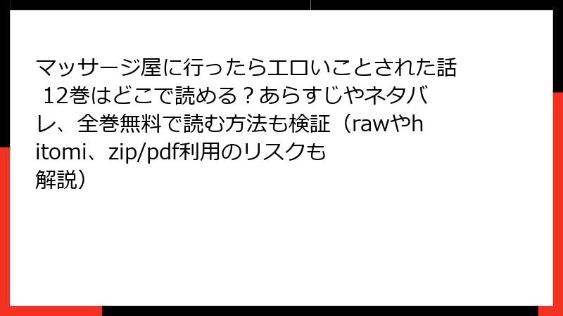 こんにちは、エロ漫画ファン歴15年の管理人です。今回は「マッサージ屋に行ったらエロいことされた話」12巻を例に、raw・hitomi・zip・pdf・漫画バンクなどの海賊版サイトで読むことの「リアルなリスク」を徹底解説します。無料で読める誘惑はわかりますが、実際に被害を受けた読者の体験談も交えて、絶対に使わないでほしい理由を5つの視点から深掘り。読み終えたら「正規版で買おう」と思える内容に仕上げました。