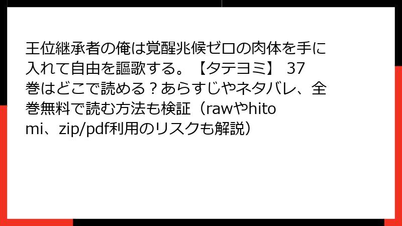 こんにちは、電子書籍マニアのブロガーです! 異世界転生の逆転ファンタジー『王位継承者の俺は覚醒兆候ゼロの肉体を手に入れて自由を謳歌する。【タテヨミ】』の電子書籍版が気になりませんか? タテヨミ形式の縦読みが魅力のこの作品、37巻まで展開が進む中、どこで手軽に読めるか迷う読者も多いはず。2025年11月9日時点の最新情報を基に、コミックシーモア、ブックライブ(BookLive)、まんが王国、ebookjapan、Renta!、めちゃコミック(めちゃコミ)、ピッコマ、LINEマンガなどの人気サービスを徹底調査しました。結論から言うと、独占配信の影響で配信先は限定的ですが、お得に楽しめるポイント満載! ネタバレなしで、配信状況と読み方のコツをブログ風に詳しく解説。まだ読んでいない方は、まずは無料試し読みからスタートしましょう♪