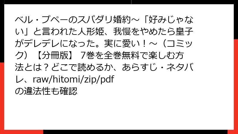 ベル・プペーのスパダリ婚約~「好みじゃない」と言われた人形姫、我慢をやめたら皇子がデレデレになった。実に愛い!~(コミック)【分冊版】 7巻を全巻無料で楽しむ方法とは?どこで読めるか、あらすじ・ネタバレ、raw/hitomi/zip/pdfの違法性も確認