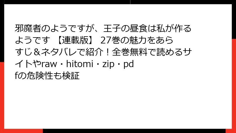 こんにちは、漫画愛好家の皆さん。今日は人気連載『邪魔者のようですが、王子の昼食は私が作るようです 【連載版】』を例に、raw・hitomi・zip・pdf・漫画バンクといった海賊版サイトで読むことの「見落としがちな本当のリスク」を徹底解説します。「無料で読めるならいいじゃん」と思うかもしれませんが、一時的な節約が、長期的な損失を生むケースが多発しています。法的・技術的・倫理的・健康的な観点から、データと事例を交えてお伝えします。読了後には「正規版を選ぶ理由」が明確になるはずです。