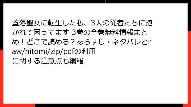 こんにちは、漫画ファンで法律オタクのブロガーです! 人気の転生ファンタジー『堕落聖女に転生した私、3人の従者たちに抱かれて困ってます』3巻、ドキドキの展開にハマっちゃいますよね。でも、raw、hitomi、zip、pdf、漫画バンクなどの海賊版サイトで「無料で今すぐ読みたい!」と思う気持ち、わかります。でも待って! 2025年現在、これらのサイトはただの罠の巣窟。法的罰則からウイルス感染、個人情報漏洩まで、命取りになるリスクが満載です。今回は、最新の事例や報告を基に、徹底的に掘り下げてお伝えします。合法ルートをおすすめしつつ、なぜ避けるべきかを読み応えたっぷりで解説。コーヒー片手に、賢い読書ライフを考えましょう!