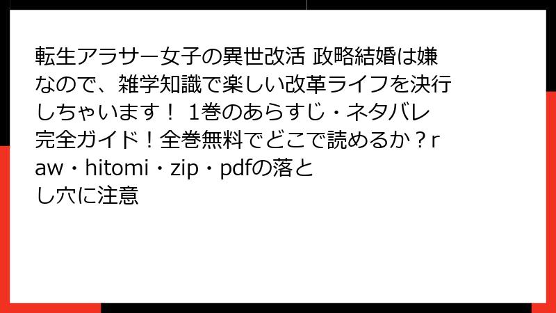 こんにちは、異世界転生ファン歴10年の管理人です。『転生アラサー女子の異世改活 政略結婚は嫌なので、雑学知識で楽しい改革ライフを決行しちゃいます!』の1巻が気になって、つい「raw」「hitomi」「zip」「pdf」「漫画バンク」などで検索しちゃった…という方、ちょっと待って! 無料で読めるのは魅力的だけど、そこには取り返しのつかないリスクが潜んでいます。今回は、2025年11月現在も変わらない「海賊版サイトの危険性」を、実際の被害事例を交えながらガッツリ解説。あなたのスマホ・PC、そして大切な個人情報を守るために、ぜひ最後まで読んでくださいね。