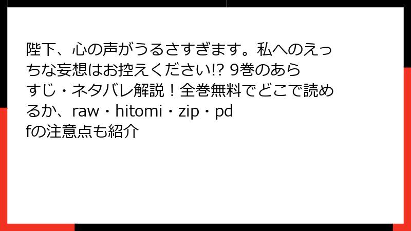 こんにちは、漫画ファンの皆さん! 人気TLコミック「陛下、心の声がうるさすぎます。私へのえっちな妄想はお控えください!?」の9巻が話題沸騰中ですが、そんな作品を無料で読みたい一心で、海賊版サイト(raw、hitomi、zip、pdf、漫画バンクなど)に手を出していませんか? しかし、これらのサイトは一見お得に見えますが、実は深刻なリスクが潜んでいます。法的トラブルからウイルス感染、個人情報漏洩まで、日常を脅かす大問題です。この記事では、最新の事例や統計を基に、詳しくリスクを掘り下げます。未読の方はネタバレなしで正規ルートをおすすめしますが、リスクを知って賢く楽しむための参考にどうぞ!