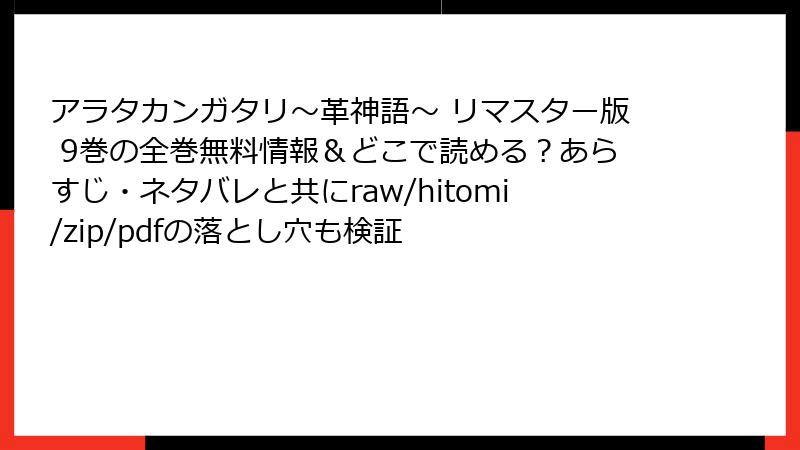 こんにちは、漫画ファン必見のブログです! 渡瀬悠宇先生の名作『アラタカンガタリ~革神語~』リマスター版を、つい「raw」「hitomi」「zip」「pdf」「漫画バンク」といった海賊版サイトで探してしまう…そんな衝動、誰にでもありますよね。でも、ちょっと待ってください! その「無料」の誘惑の裏には、想像以上の危険が潜んでいます。今日は、法的・セキュリティ・倫理的な観点から、リスクを徹底的に解説。9巻のネタバレを味わう前に、まずは安全な読み方をマスターしましょう!