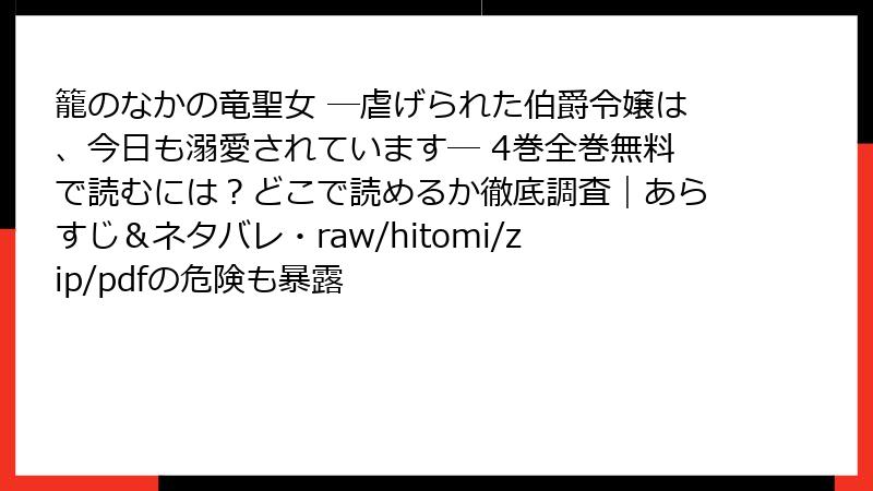 こんにちは、マンガセキュリティウォッチャーのセキュリティオタクです! 今日も異世界ファンタジー溺愛ものが大好きな私ですが、今回はちょっとシリアスな話題。人気コミック『籠のなかの竜聖女 ―虐げられた伯爵令嬢は、今日も溺愛されています―』のような作品を、raw、hitomi、zip、pdf、漫画バンクなどの海賊版サイトで読もうとする人が後を絶ちません。でも、待って! 「無料で読める」って誘惑に負けると、取り返しのつかない被害に遭う可能性大なんです。