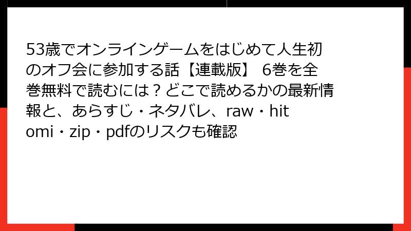 こんにちは、漫画愛護ブロガーです。今日は、ほっこり心温まる傑作53歳でオンラインゲームをはじめて人生初のオフ会に参加する話【連載版】(作者:直正也)を、raw/hitomi/zip/pdf/漫画バンクなどの海賊版サイトで読むことの「本当の代償」について、ガチで深掘りします。2025年11月現在、海賊版のリスクは年々深刻化しており、単なる「無料=お得」では済まされません。法的・技術的・倫理的の3軸から、具体例を交えて徹底解説します。