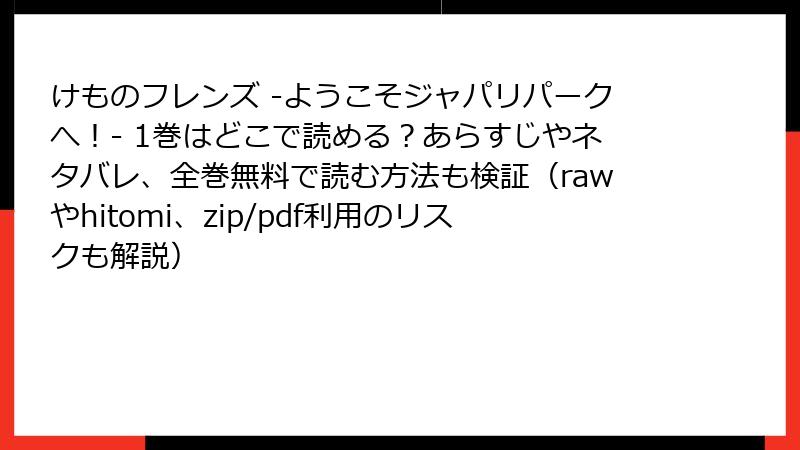 「けものフレンズ ‐ようこそジャパリパークへ!‐」は、公式にKADOKAWAから発売されている正規コミックです。しかし、インターネット上には「raw」「hitomi」「漫画バンク」「zip」「pdf」といった海賊版サイトが横行し、無料で読めるように見せかけています。一見便利そうですが、実際には法的な問題からデバイス破損、個人情報流出、さらには犯罪加担まで、取り返しのつかないリスクが潜んでいます。以下でその全貌を徹底解説します。