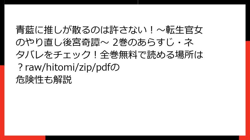 こんにちは、漫画大好きだけど安全第一のブロガーです! 2025年11月現在、最新の人気作を「無料で今すぐ読みたい!」という衝動は誰しも一度は抱きますよね。特に『青藍に推しが散るのは許さない!』のような魅力的な転生ファンタジー作品にハマったら、raw、hitomi、zip、pdf、漫画バンク(やその後継サイト)などの海賊版サイトに手を出したくなる気持ち、よくわかります。でも、これらのサイトは一見の無料パラダイスに見えて、法的罰則、ウイルス感染、個人情報漏洩、倫理的問題という多大なリスクが潜んでいます。実際の被害報告が急増中で、軽い気持ちでアクセスすると取り返しのつかない事態に…。このブログ記事では、そんな海賊版サイトの闇を多角的に深掘り。読み応え満載で、複数のセクションに分けて解説します。結論から言うと、絶対に避け、正規ルートで楽しむのが賢明! 作者の努力を尊重し、安全にハマるための警鐘を鳴らしますよ。