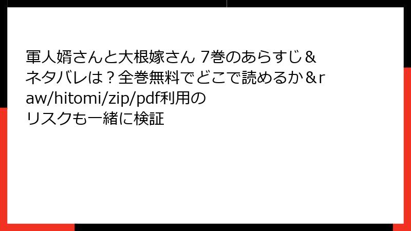こんにちは、漫画ブロガーの“まんが防衛隊”です。今日は、コマkoma先生の人気作『軍人婿さんと大根嫁さん』を、raw、hitomi、zip、pdf、漫画バンクといった海賊版サイトで読むことの「リアルなリスク」を、徹底的に掘り下げます。