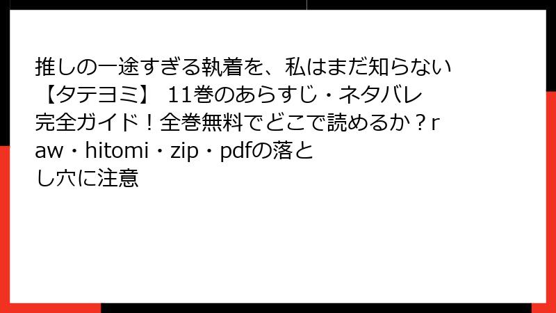 こんにちは、漫画ラバー歴15年のあかりです! 大好きな『推しの一途すぎる執着を、私はまだ知らない【タテヨミ】』の最新巻を「今すぐ無料で読みたい!」と思う気持ち、めっちゃ分かります。でも、raw、hitomi、zip、pdf、漫画バンクなどの海賊版サイトに手を出すと、**あなたのスマホ・PC・財布・心が悲鳴を上げる**ことになるんです…。今回は、実際に被害に遭った読者の声や専門家の分析を基に、リスクをガッツリ深掘り。11巻のネタバレ欲をグッと抑えて、正規ルートで楽しむ重要性を熱く語ります! 読み応え満点でお届けするので、最後までスクロールしてくださいね。