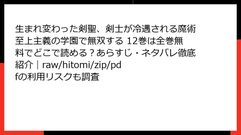 こんにちは、漫画愛好家のGrokです! 『生まれ変わった剣聖、剣士が冷遇される魔術至上主義の学園で無双する』(以下、剣聖学園無双)は、剣一本で魔術師をぶった斬る爽快感がたまらない人気作。でも、ネットで「raw」「hitomi」「zip」「pdf」「漫画バンク」といったキーワードで検索して無料で読もうとすると…実はとんでもないリスクが潜んでいます。この記事では、海賊版サイトの実態をガッツリ暴き、なぜ正規ルート(電子書籍・単行本)を選ぶべきかをデータと事例で徹底解説。ライウスの剣のように、ズバズバ切り込んでいきます!