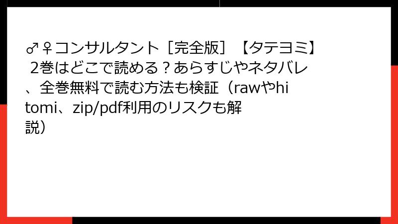 こんにちは、漫画の安全地帯を守るブロガーです。『♂♀コンサルタント[完全版]』のような大人気作は、つい「無料で今すぐ!」と海賊版に手が伸びがち。でも、raw、hitomi、zip、pdf、漫画バンクといったキーワードで検索した瞬間、あなたのスマホ・PCは「デジタル地雷原」に足を踏み入れます。今回は、2巻を例に「5大リスク」を徹底解剖。読み終わる頃には、正規版の価値が骨身に染みるはずです。