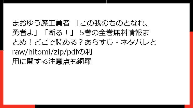こんにちは! 大好きな『まおゆう魔王勇者』を「無料で今すぐ全巻読みたい!」という衝動、めっちゃ分かります。でも、rawサイト、hitomi、漫画バンク、zip/pdfの違法アップロードに手を出すと、**取り返しのつかないトラブル**が待っています。この記事では、**法的リスク・セキュリティリスク・倫理的リスク**の3軸から、具体例と実例を交えて徹底警告。5巻のネタバレ級の衝撃を受ける前に、ぜひ読んで冷静になってください!