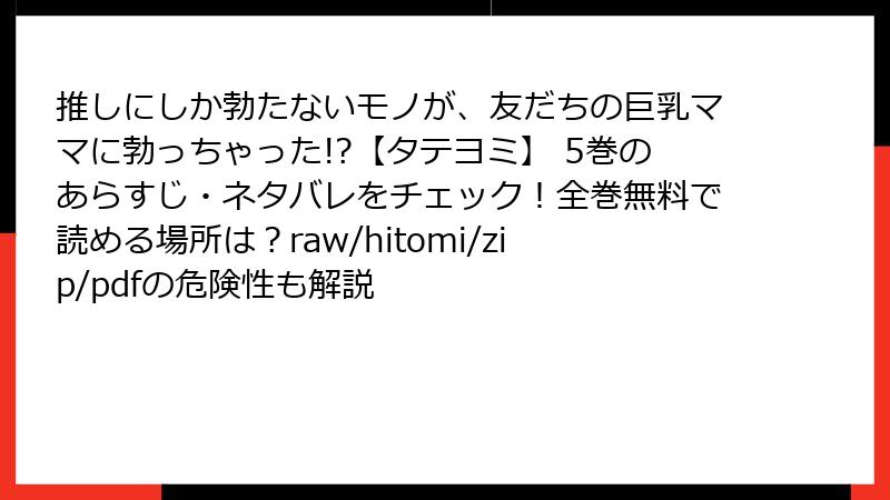 みなさん、こんにちは! 漫画の深掘りブロガーです。今回は、前回のあらすじレビューに続き、待望の『推しにしか勃たないモノが、友だちの巨乳ママに勃っちゃった!?』5巻の完全ネタバレをお届けします。タイトルからして過激ですが、この巻はエロスとドラマの融合が頂点に達し、読後感がヤバい一冊。ネタバレ全開なので、まだ読んでいない方は今すぐ本を閉じてくださいね(笑)。章ごとに細かく分解し、キーシーンや心理描写を徹底解説。読み応えを重視して、テーブルやリストも活用します。さあ、禁断の関係の深淵に飛び込みましょう!
