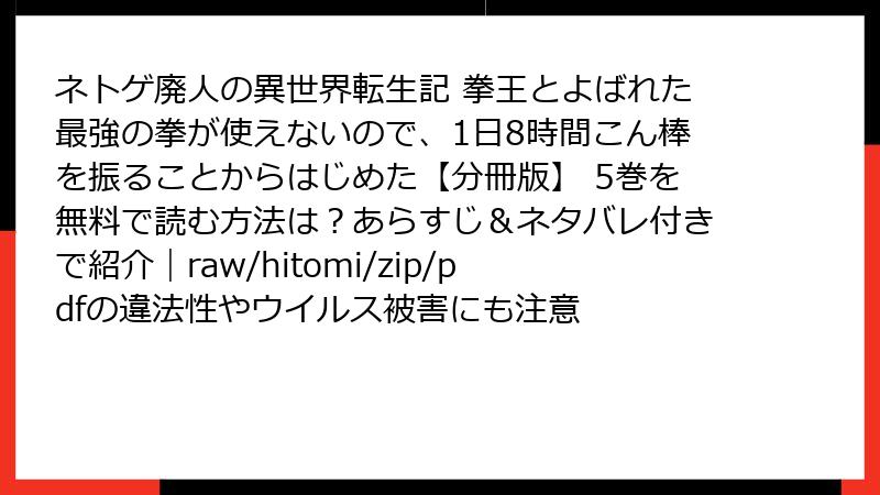 ネトゲ廃人の異世界転生記 拳王とよばれた最強の拳が使えないので、1日8時間こん棒を振ることからはじめた【分冊版】 5巻を無料で読む方法は?あらすじ&ネタバレ付きで紹介|raw/hitomi/zip/pdfの違法性やウイルス被害にも注意