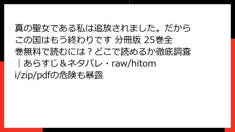 みなさん、こんにちは! 異世界ファンタジー好きのブログ主です。今日は、熱い人気作「真の聖女である私は追放されました。だからこの国はもう終わりです」の分冊版25巻を、raw・hitomi・zip・pdf・漫画バンクなどの海賊版サイトで読むことのリスクを、ガッツリ詳しくお届けします。無料で読めるとつい手を伸ばしたくなる気持ち、わかります。でも、その裏には想像以上の危険が潜んでいるんです。作者さんや出版社を応援するためにも、正規ルートでの購入をおすすめしたい…という思いを込めて、読み応えのある記事にまとめました。さあ、深く掘り下げていきましょう!