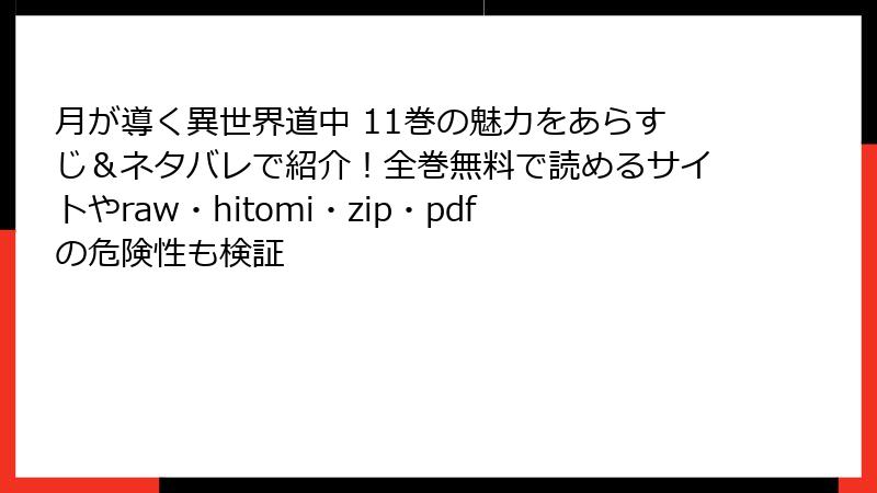 人気異世界ファンタジー『月が導く異世界道中』の最新巻を「無料で今すぐ読みたい!」——そんな誘惑に駆られて、raw、hitomi、漫画バンク、zip、pdfといった海賊版サイトに手を伸ばしていませんか? 確かに一見「便利」ですが、その裏には**読者自身を破滅に導く深刻なリスク**が潜んでいます。今回は、法的・経済的・セキュリティ的・倫理的の4軸から、具体例を交えて詳しく解説。1巻から11巻まで、クズノハ商会のように「安全第一」で楽しむための警鐘です。