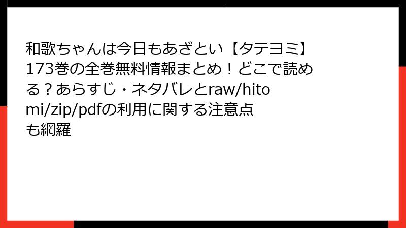 こんにちは、漫画大好きブロガーの「まんが守護者」です。今日は、**『和歌ちゃんは今日もあざとい【タテヨミ】』** を **raw / hitomi / zip / pdf / 漫画バンク** などの海賊版サイトで読むことの**深刻なリスク**を、5つの観点から徹底解説します。無料で読めると聞くと魅力的ですが、**あなたのスマホ・PC・個人情報・そして作者の未来**が、知らぬ間に蝕まれているかもしれません。2025年11月現在、海賊版対策はさらに厳しくなっています。**「たかが漫画」では済まされない現実**を、データと事例を交えてお伝えします。