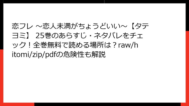 こんにちは、漫画ブロガーです! 今日は大好きな恋フレ ~恋人未満がちょうどいい~【タテヨミ】の25巻について語りたい…のではなく、「raw」「hitomi」「漫画バンク」「zip」「pdf」などの海賊版サイトで読むことの危険性をガチで解説します。「無料で読めるからラッキー♪」なんて思ってる方、ちょっと待って! 実は、あなたのスマホ・PC・個人情報・そして作者さんたちの未来が、静かに蝕まれているんです。この記事では、法的・技術的・倫理的な観点から、リスクを