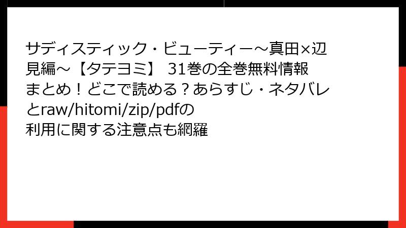 などの箇条書きのHTMLタグや、tableタグも使用してOK。ただし、リンクやURLは、絶対に、挿入しない。サディスティック・ビューティー~真田×辺見編~【タテヨミ】 31巻 この漫画・コミックの、あらすじを詳しく。単一の