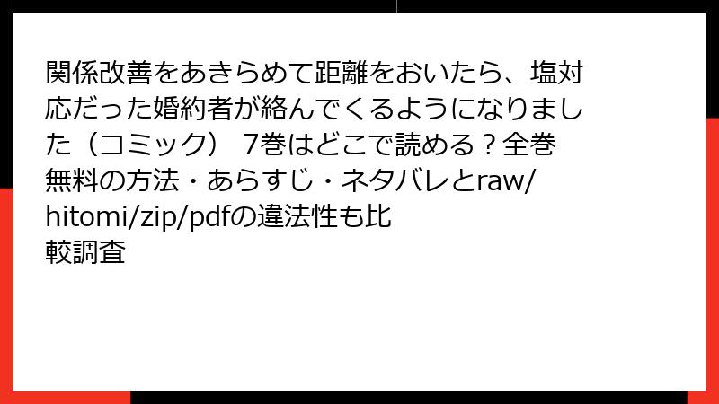 - 「関係改善をあきらめて距離をおいたら、塩対応だった婚約者が絡んでくるようになりました」海賊版サイト(raw/hitomi/zip/pdf/漫画バンクなど)で読む本当のリスク大公開!