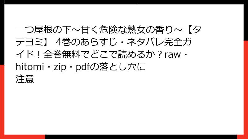 みなさん、こんにちは! 漫画好きのブロガー、[あなたの名前]です。人気エロティック・ロマンス『一つ屋根の下~甘く危険な熟女の香り~』(gregor&JJangE著)を、raw、hitomi、zip、pdf、漫画バンクなどの海賊版サイトで読もうとしている方へ――ちょっと待ってください! 無料で読める誘惑は大きいですが、そこには深刻なリスクが潜んでいます。今回は、法的・セキュリティ・倫理的な観点から、海賊版利用の危険性を詳しく解説。読み応えのあるブログ記事として、複数のセクションに分けてお届けします。2025年11月現在、合法プラットフォームで安心して楽しむのがベストです!