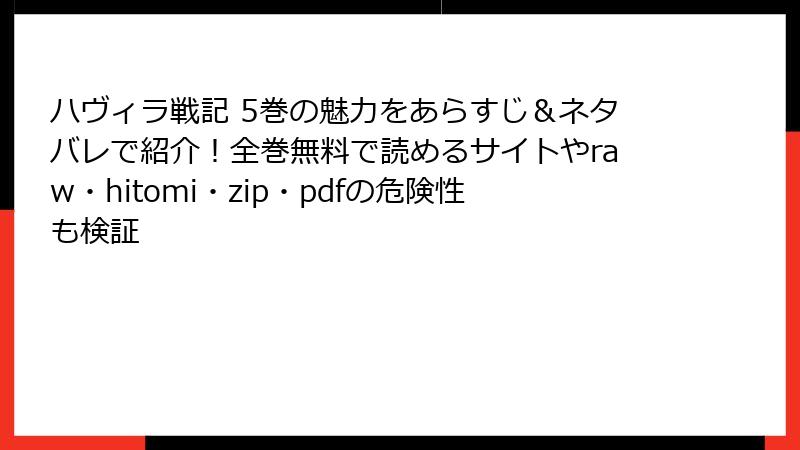こんにちは、漫画ファン歴20年のブロガーです! 今日のテーマは、みなさんが大好きな『ハヴィラ戦記』を、rawやhitomi、zip/pdf形式のダウンロード、漫画バンクなどの海賊版サイトで読むことの「リアルなリスク」。無料で最新巻が読める誘惑は大きいですが、実はそこには見えない落とし穴が無数に潜んでいます。この記事では、法的・セキュリティ・倫理的な観点から徹底的に掘り下げます。5巻の興奮を味わいたい気持ちはわかりますが、まずはこのリスクを知って、正しい選択をしましょう。ネタバレなしで、読み応え満点の警告をお届けします!