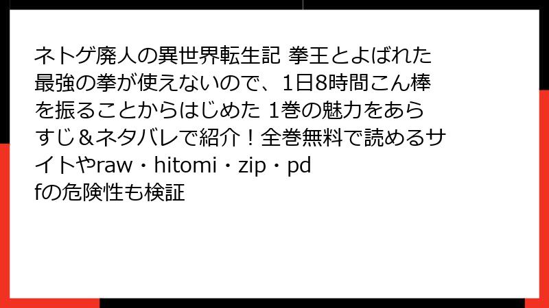 どうも、異世界転生漫画ハンターのブロガーです! 2025年夏にコミカライズ1巻が発売されて以来、話題を呼んでいるネトゲ廃人の異世界転生記 拳王とよばれた最強の拳が使えないので、1日8時間こん棒を振ることからはじめた(以下、こん棒転生記)。原作小説は第8回ネット小説大賞受賞作で、VRMMORPG廃人魂が炸裂するバトルファンタジーとしてファンを魅了中。今回は、ネット上のレビュー、X(旧Twitter)の口コミ、全体評判を徹底調査! ネタバレ控えめに、読み応え満載でまとめました。廃人諸君、こん棒を振る準備はいいか?