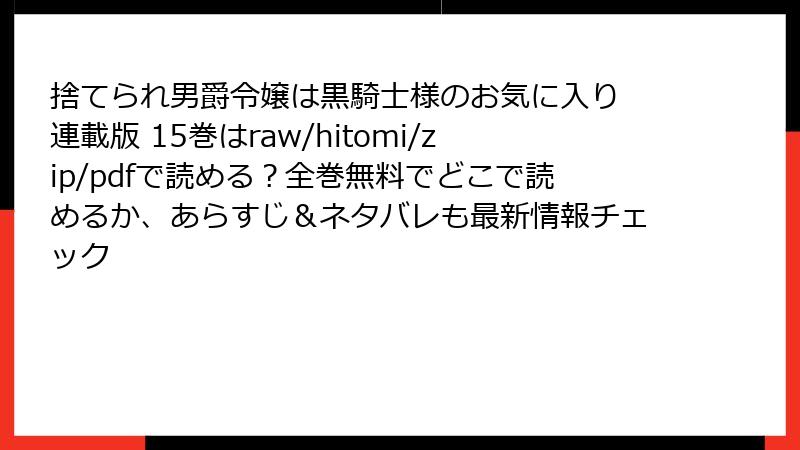 こんにちは、漫画ラバー管理人です! 大人気ファンタジー・ロマンス『捨てられ男爵令嬢は黒騎士様のお気に入り 連載版』の最新巻が気になって、つい「raw」「hitomi」「zip」「pdf」「漫画バンク」などのキーワードで検索しちゃった…そんな経験、ありませんか? 確かに無料でサクッと読める誘惑は大きいですが、実はそこには巨大なリスクが潜んでいます。今回は、法的トラブル、ウイルス感染、作者・出版社へのダメージまで、ブログ形式で詳しくお届け。15巻のネタバレを避けつつ、海賊版の闇を暴きます! 読み終えたら、正規版で応援したくなるはずですよ。
