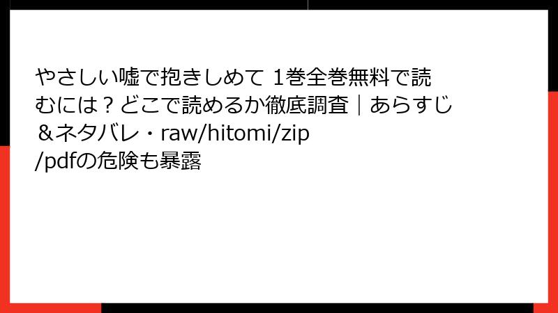 こんにちは、電子書籍ハンターのみこです! 稲穂米先生のラブサスペンス『やさしい嘘で抱きしめて』が、切ない嘘と甘い恋の物語で今も大人気。2025年11月現在、12巻まで配信中で、めちゃコミックでの先行連載が熱いですよね。今回は、皆さんが気にするコミックシーモア、ブックライブ、まんが王国、ebookjapan、Renta!、めちゃコミック、ピッコマ、LINEマンガなどのサービスで、この作品がどこで読めるかを詳しく調査・まとめました。無料試し読みの有無や料金目安も交えて、読み応え満点でお届け。あなたにピッタリのプラットフォームを見つけましょう!