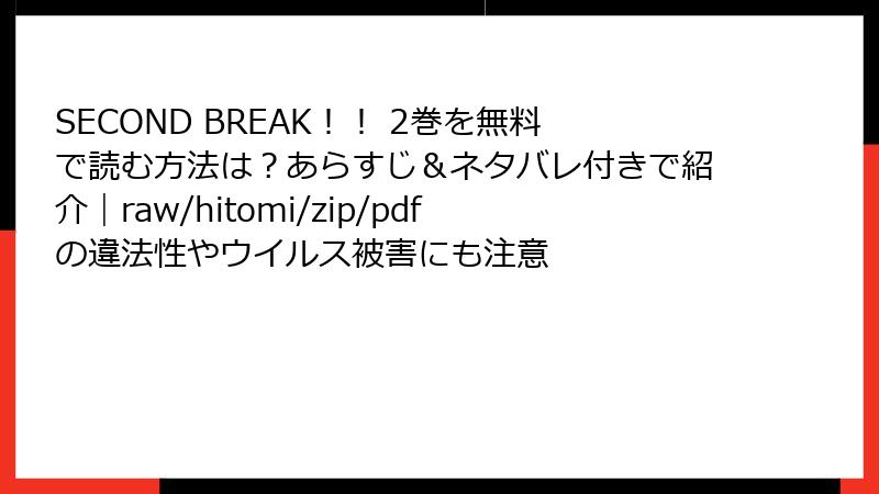 「SECOND BREAK!!」の2巻が熱すぎて「今すぐ読みたい!」って気持ち、めっちゃわかります。でも、Googleで「SECOND BREAK!! raw」「漫画バンク」「hitomi」「zip」「pdf」って検索して出てくる怪しいサイト…あれ、本当に使っちゃダメです。
