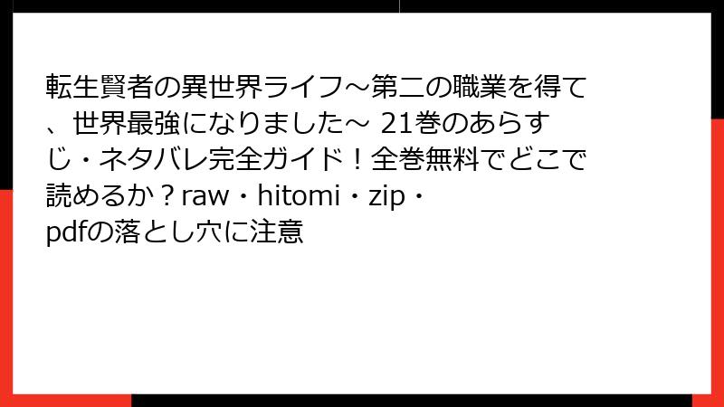 皆さん、こんにちは! 異世界転生漫画の鉄板、転生賢者の異世界ライフ~第二の職業を得て、世界最強になりました~の第21巻ネタバレ特集をお届けします。前回のあらすじレビューが好評だったようで、今回はガッツリネタバレ満載で深掘り! ユージのチート無双が学園の「地獄イベント」でどう炸裂するのか、ストーリーの裏側やキャラクターの心理まで、ブログ風に複数セクションで読みやすくまとめました。未読の方は絶対に止まってくださいね。本題の『研究所』追跡は少しお休みですが、この巻のコメディ要素が最高にクセになります。では、早速本編へGO!