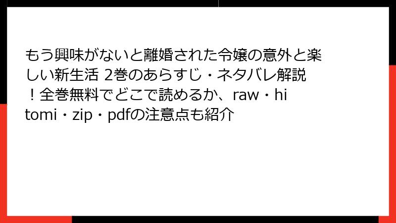 もう興味がないと離婚された令嬢の意外と楽しい新生活 2巻のあらすじ・ネタバレ解説!全巻無料でどこで読めるか、raw・hitomi・zip・pdfの注意点も紹介