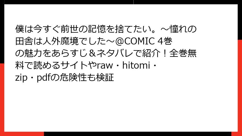 - 「僕は今すぐ前世の記憶を捨てたい。~憧れの田舎は人外魔境でした~」をraw・hitomi・漫画バンクなどで読むと、こんなヤバいリスクが待っている