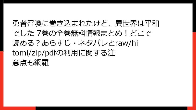 - 「帰還した結界術の天才」「俺だけレベルMAXなビギナー」「勇者召喚に巻き込まれたけど異世界は平和でした」を海賊版(raw・hitomi・漫画バンク・zip・pdf)で読むと起こるリアルなリスク