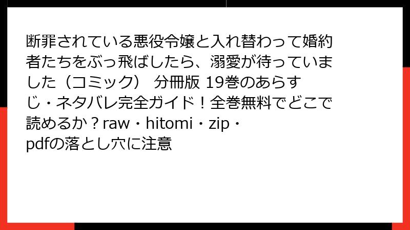 痛快悪役令嬢転生『断罪されている悪役令嬢と入れ替わって婚約者たちをぶっ飛ばしたら、溺愛が待っていました』19巻電子ガイド! 双葉社モンスターコミックスfの分冊版がめちゃコミで5話無料、2025年11月現在、シーモア1巻無料が狙い目。脳筋ぶっ飛ばしと溺愛の爽快感を、キャンペーンで。