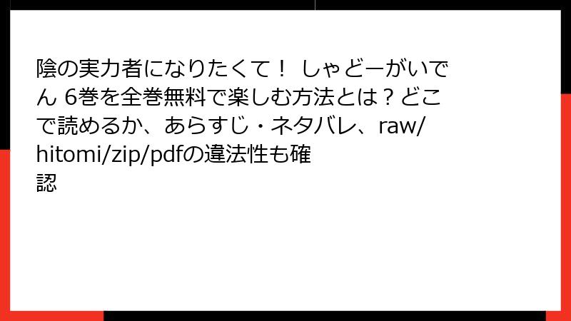 人気のファンタジー漫画「陰の実力者になりたくて! しゃどーがいでん」の第6巻を、raw、hitomi、zip、pdf、漫画バンクなどの海賊版サイトで無料で読もうと考える人もいるかもしれません。しかし、そんな選択には深刻なリスクが伴います。この記事では、法的、セキュリティ、倫理的、品質面での危険性を詳しく解説します。海賊版は一時的な便利さを提供するかもしれませんが、長期的に見て損失が大きいことを理解しましょう。ネタバレやストーリーとは関係なく、純粋にリスクに焦点を当てます。