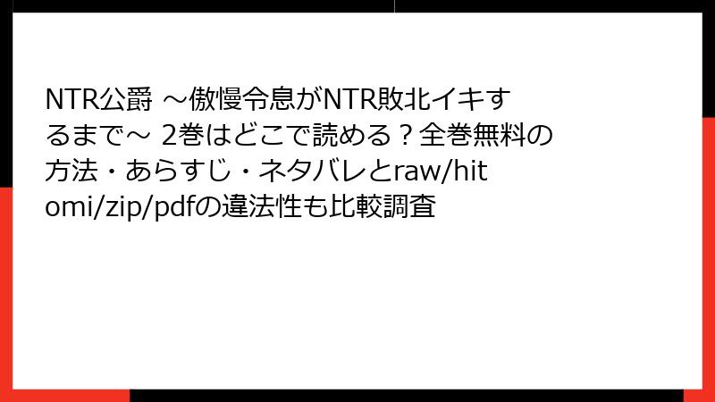 raw、hitomi、zip、pdf、漫画バンクなどの海賊版サイトで「NTR公爵 ~傲慢令息がNTR敗北イキするまで~ 2巻」を読むのは、法的・セキュリティ・経済的・倫理的なリスクが大きすぎます。これらのリスクを避けるため、正規の電子書籍サービスや公式サイトを利用しましょう。安全に作品を楽しむことが、作者とファンの両方を守ることにつながります。