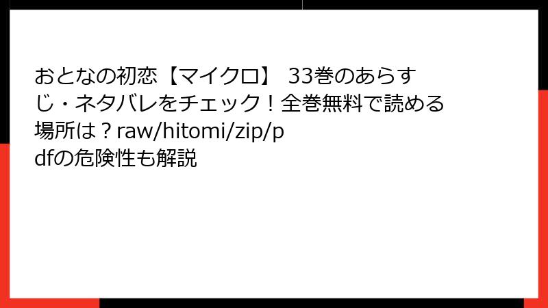 大人気漫画『おとなの初恋【マイクロ】』の33巻、魅力的なストーリーに夢中になるファンが多いですよね。でも、raw、hitomi、zip、pdf、漫画バンクなどの海賊版サイトで無料で読もうと考える人もいるはず。そんな行為には、意外と知られていない深刻なリスクが潜んでいます。この記事では、法的問題からセキュリティの脅威まで、詳しく掘り下げてお伝えします。海賊版を利用する前に、ぜひ一読を。合法的な方法で楽しむのが一番ですよ!