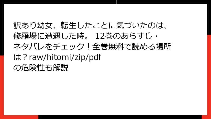 結局、海賊版は一時的な満足でしかなく、長期的に損をする選択。『訳あり幼女、転生したことに気づいたのは、修羅場に遭遇した時。 12巻』のような魅力的な作品を、正しく楽しむことで、漫画文化を支えましょう。