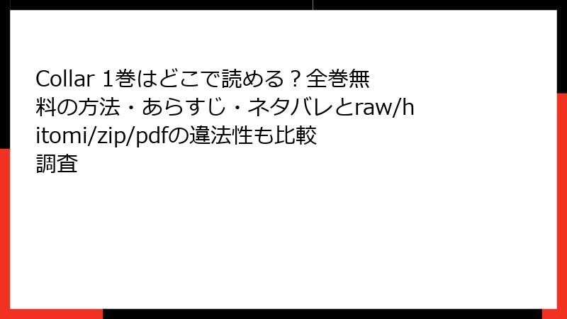 こんにちは、漫画ファン向けのブログです。今回は、人気BL作品『Collar』第1巻を、raw、hitomi、zip、pdf、漫画バンクなどの海賊版サイトで読むことのリスクについて詳しく解説します。これらのサイトは無料でアクセスしやすく魅力的に見えますが、実は多大な危険が潜んでいます。法的問題からセキュリティの脅威まで、さまざまな側面を掘り下げてお届けします。海賊版利用を考えている方は、ぜひこの記事を読んで再考してください。以下では、カテゴリごとにリスクを整理し、表やリストでわかりやすくまとめます。