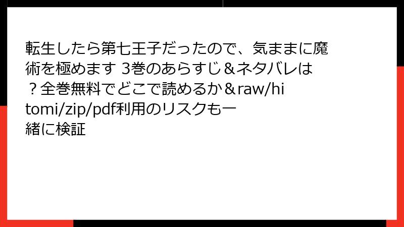 人気の異世界ファンタジー漫画「転生したら第七王子だったので、気ままに魔術を極めます」の3巻を楽しみたいと思っている読者の方々へ。raw、hitomi、zip、pdf、漫画バンクなどの海賊版サイトを利用するのは、手軽に見えるかもしれませんが、実はさまざまな深刻なリスクが伴います。この記事では、それらのリスクを法的、セキュリティ、品質、経済的・倫理的観点から詳しく解説します。海賊版の利用は、短期的な便利さ以上に長期的な損失を生む可能性が高いのです。ぜひ正規ルートでの読書をおすすめします。