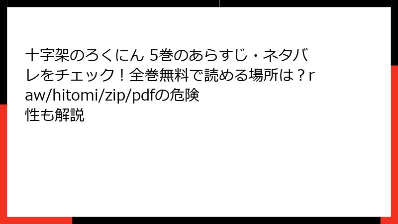 『十字架のろくにん』5巻は、中武士竜による背徳の復讐サスペンスの人気巻で、電子書籍として多くのプラットフォームで配信されています。今回は、コミックシーモア、ブックライブ(BookLive)、まんが王国、ebookjapan、Renta!、めちゃコミック(めちゃコミ)、ピッコマ、LINEマンガなどの主要サービスを中心に、どこで読めるかを詳しく解説します。各サービスの特徴、価格、試し読みの有無などを比較し、読み応えのある選び方を提案。2025年現在、講談社作品として幅広い配信網を活かし、電子版は紙書籍と同等のクオリティで楽しめます。配信状況は変動する可能性があるので、最新情報を確認してください。