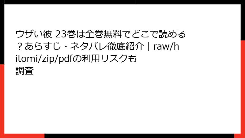 『ウザい彼 23巻』をraw/hitomi/zip/pdf/漫画バンクなどで読むのは、法的罰則からプライバシー侵害まで多大な危険を伴います。実体験からもわかるように、一度のアクセスが人生を変える被害を生むかも。代わりに正規ルートを選び、安心して物語を堪能しましょう。あなたはどう思う? コメントでシェアを。